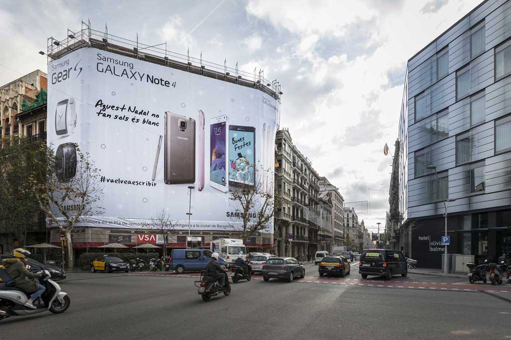 SAMSUNG demuestra con #vuelveaescribir de su GALAXY NOTE 4 que somos unos nostálgicos a través de esta espectacular lona publicitaria en la calle Balmes de Barcelona, un magnífico emplazamiento de gran notoriedad, con un IMD de 55.900 vehículos/día, ubicado en pleno barrio del Eixample, una zona eminentemente residencial, de negocios y comercial.