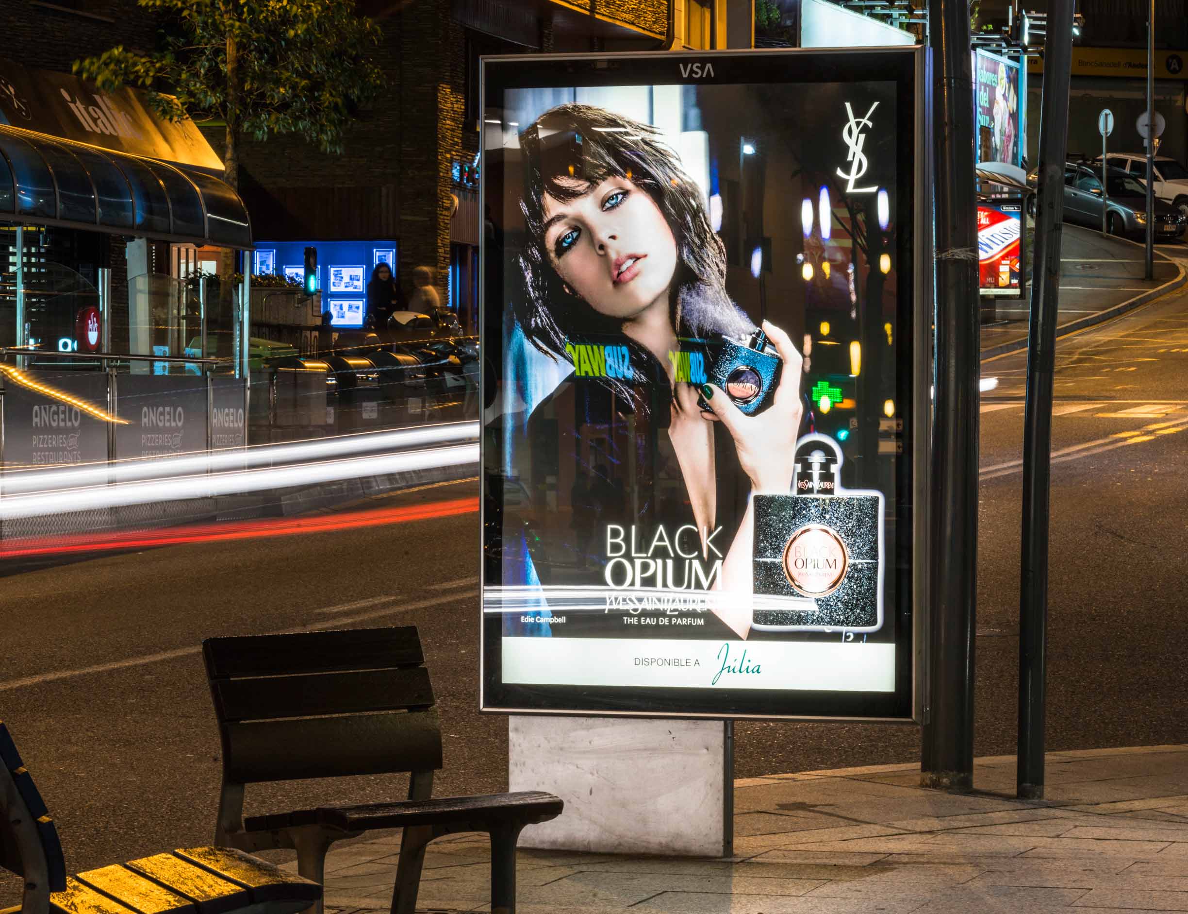PERFUMERIA JULIA ha contado con el Mobiliario Urbano de VSA COMUNICACION, abarcando los Parroquias de Escaldes-Engordany y Andorra la Vella, para presentarnos la fragancia femenina de YVES SAINT LAURENT que por primera vez fusiona notas floras con notas de café, BLACK OPIUM.