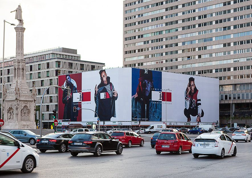 Se trata, sin duda, de uno de los mejores emplazamientos de la ciudad, ideal para la campaña de publicidad exterior de TOMMY HILFIGER y esta fantástica lona publicitaria para presentar la primera colección cápsula del famoso piloto de Fórmula 1, Lewis Hamilton: TOMMYXLEWIS.