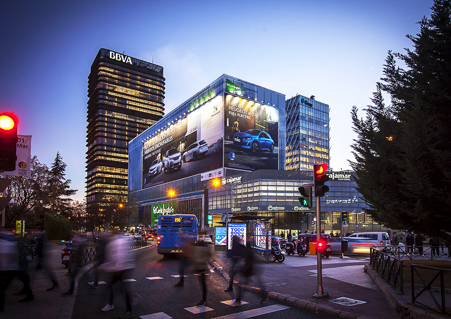 PEUGEOT nos presenta, a través de la céntrica y altamente visible lona publicitaria de VSA COMUNICACION en el Paseo de la Castellana de Madrid, la nueva generación de híbridos enchufables y el nuevo PEUGEOT e-208 FULL ELECTRIC.