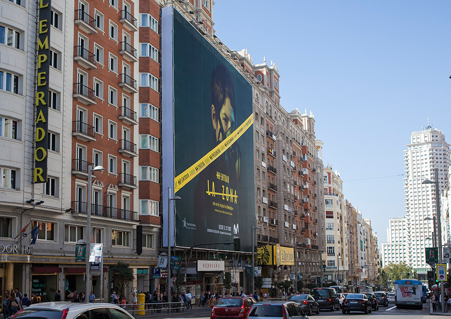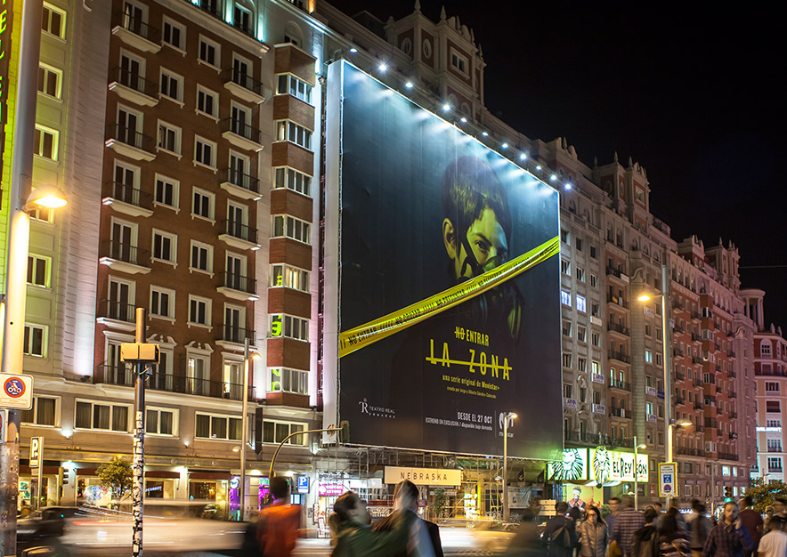 Estrenamos emplazamiento en la céntrica y concurrida Gran Vía de Madrid con esta espectacular lona publicitaria de la nueva serie original de MOVISTAR + que también se estrena hoy, LA ZONA, y que podremos ver todos los jueves a partir de la próxima semana.