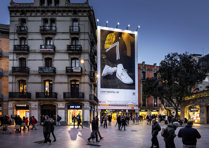 La marca alemana de calzado y ropa deportiva ADIDAS ha elegido el emplazamiento de VSA COMUNICACION ubicado en la Avenida Puerta del Ángel de Barcelona para presentar su modelo de deportivas CONTINENTAL 80 a través de nuestra lona publicitaria, con una creatividad muy «a la última» y moderna, con la que los 80 vuelven con fuerza.