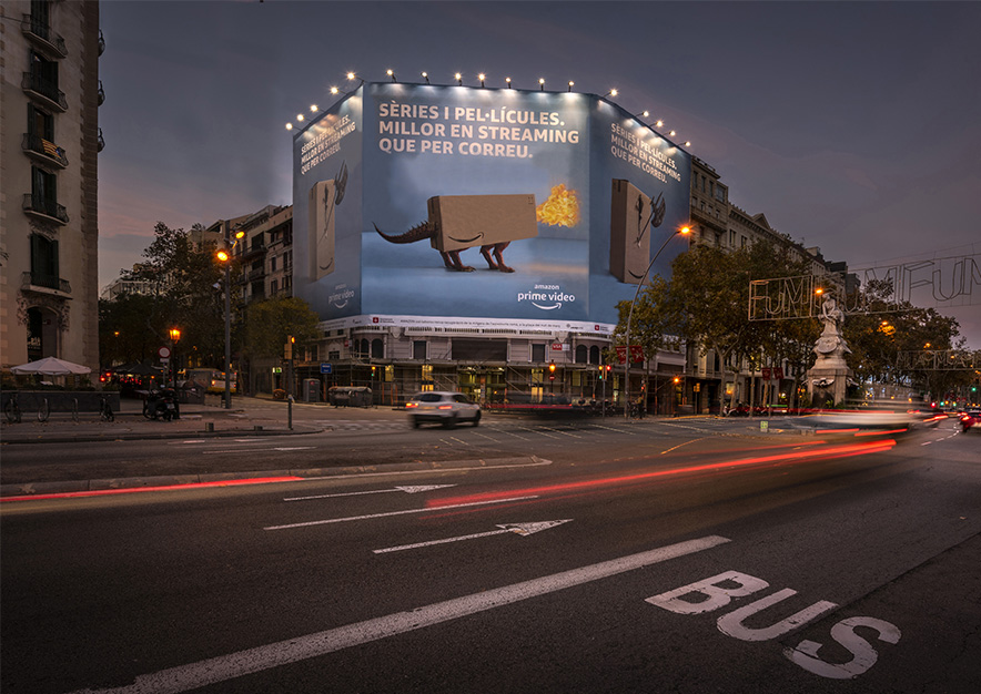 Espectacular lona publicitaria de AMAZON PRIME VIDEO en el nuevo y céntrico emplazamiento de VSA COMUNICACIÓN ubicado en la Gran Vía frente el Hotel Palace de Barcelona, a tan solo dos manzanas de la Plaza Cataluña y el prestigioso Paseo de Gracia.