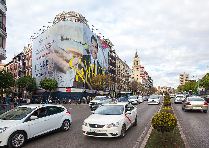 Esta increíble lona publicitaria, junto a VSA COMUNICACION y su emplazamiento Premium ubicado en la concurrida y conocida calle Alcalá, ha sido la elegida para su campaña de publicidad exterior e informar del último concierto de esta gira en nuestro país, que se celebrará en la ciudad de Madrid el próximo día 11.