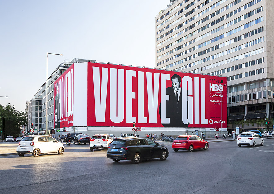 Impactante e impresionante lona publicitaria de la plataforma HBO para anunciar el estreno el próximo 7 de julio de su nueva serie, EL PIONERO, la serie documental de Jesús Gil, en el emplazamiento PREMIUM de VSA COMUNICACION en la Plaza Colón de Madrid, como medio de exterior incluido en su campaña de publicidad.