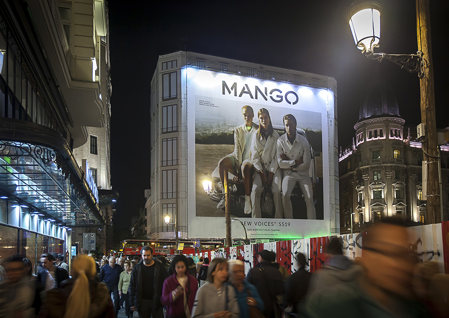 Espectacular campaña de publicidad exterior de la multinacional de moda MANGO con una increíble lona publicitaria en el emplazamiento Premium de VSA COMUNICACION en plena Gran Vía de Madrid.