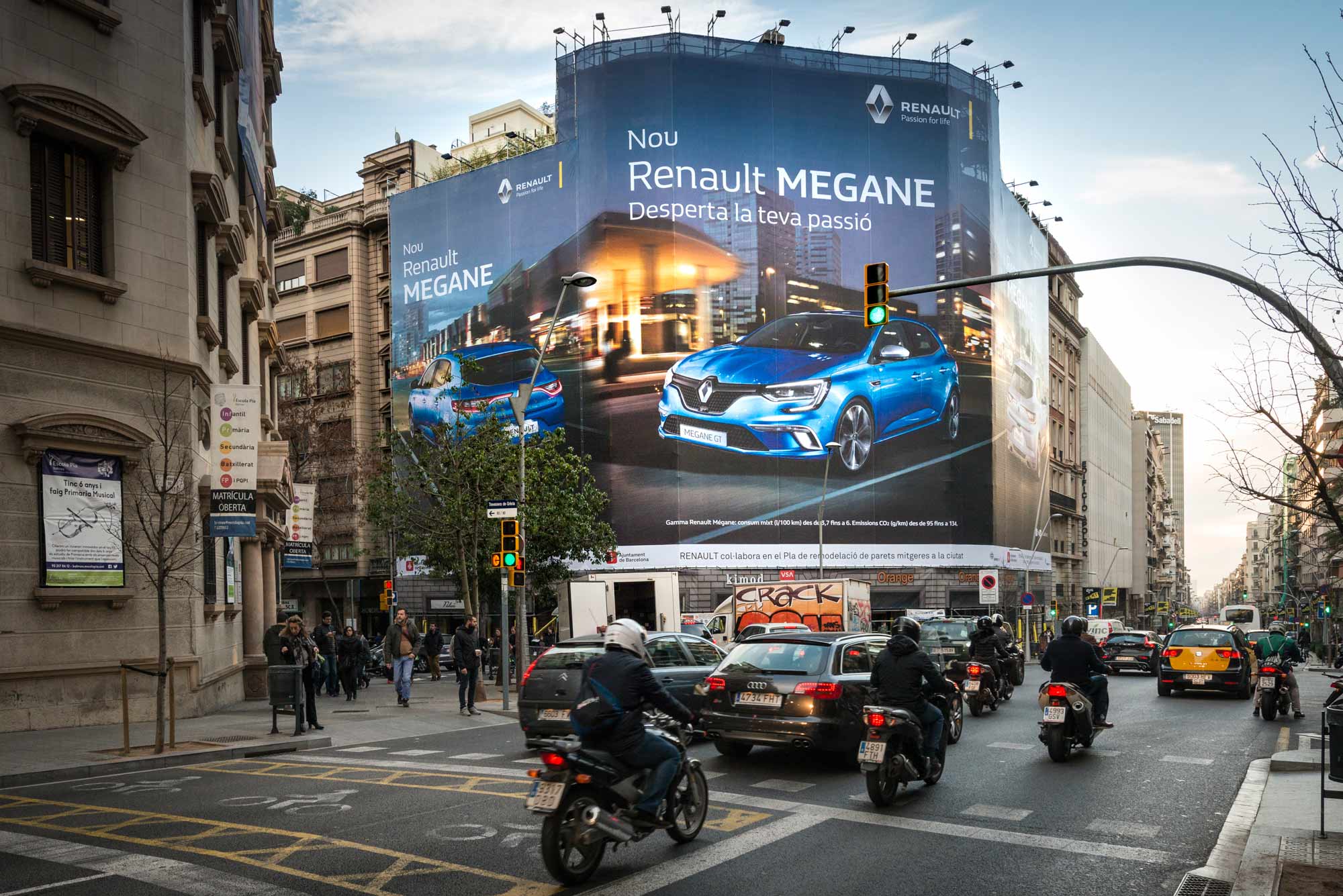 Esta increíble lona publicitaria del nuevo RENAULT MEGANE está expuesta en el emplazamiento premium de VSA COMUNICACION en la calle Balmes, con una espectacular visibilidad tanto desde la transitada calle Balmes dirección Plaza Cataluña como desde Travesera de Gracia.