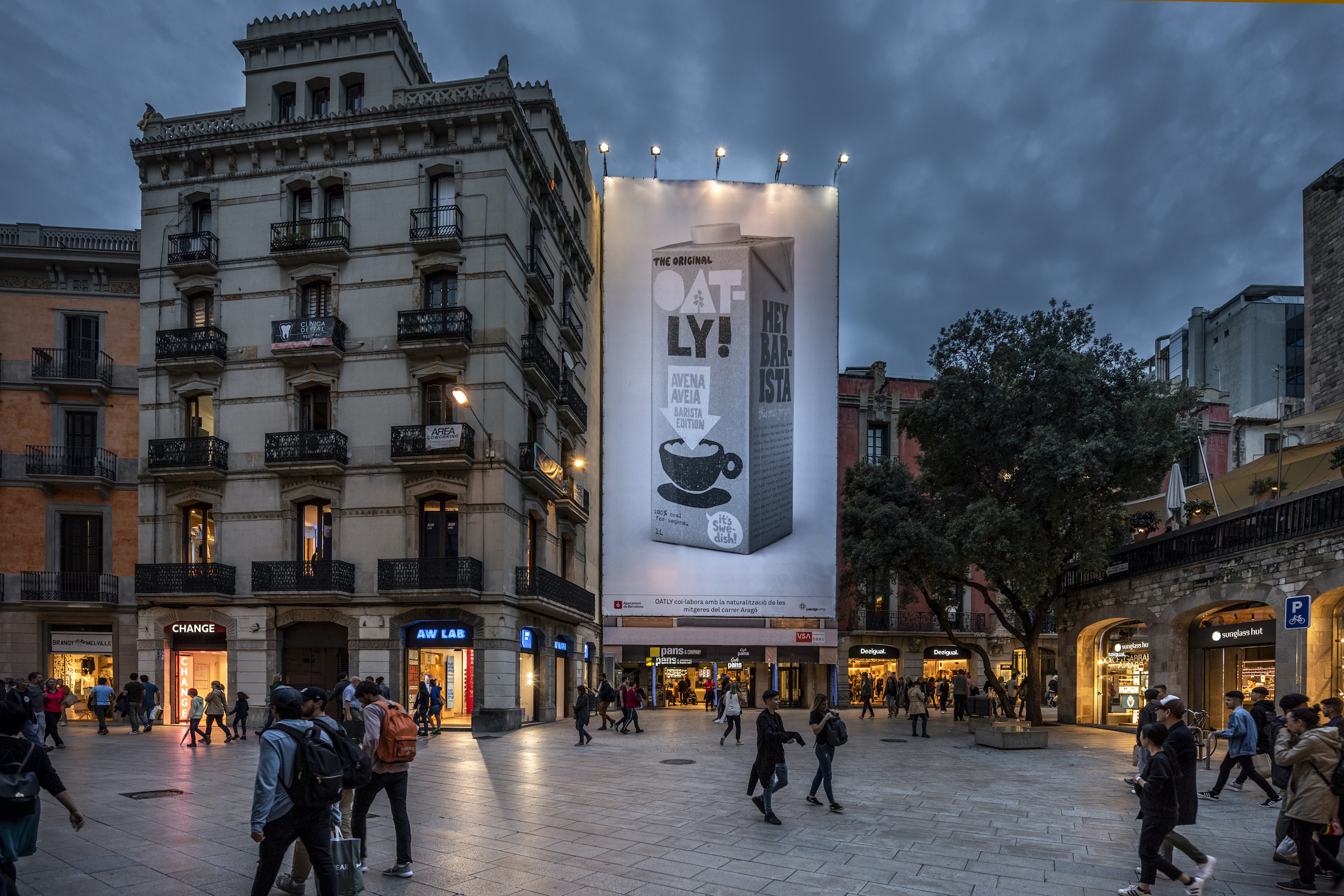 Inauguramos el nuevo emplazamiento de VSA COMUNICACIÓN cerca de la Puerta del Ángel de Barcelona, en el núcleo comercial y corazón de la ciudad condal, con esta espectacular lona publicitaria incluida en la campaña de publicidad exterior que ha iniciado la mejor bebida de avena sueca OATLY!.