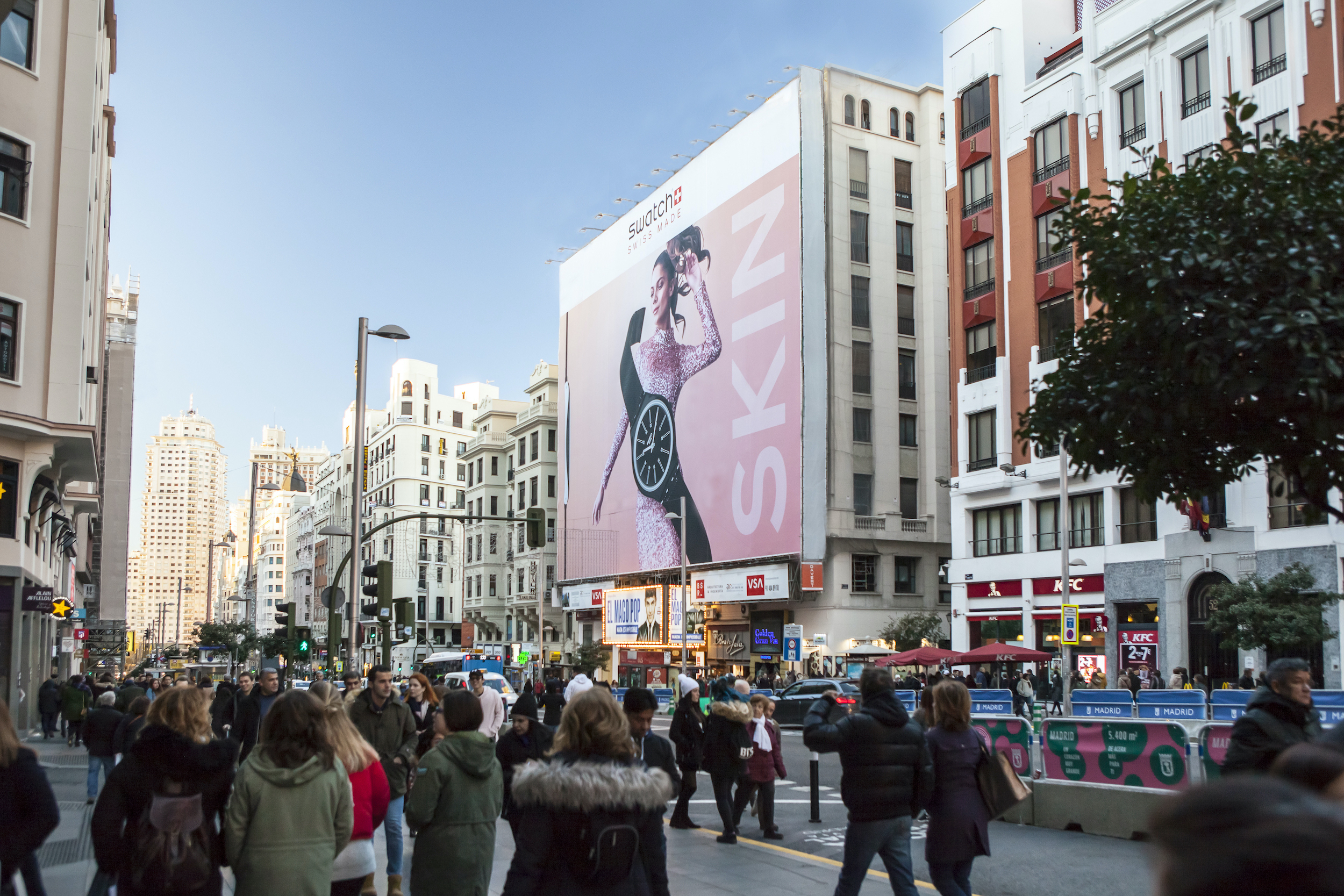 El emplazamiento de VSA COMUNICACIÓN ubicado en Gran Vía, 54 de Madrid, ha sido elegido para presentar esta campaña de publicidad exterior diseñada para la presentación de su colección SWATCH SKIN, formada por 22 fantásticos relojes.