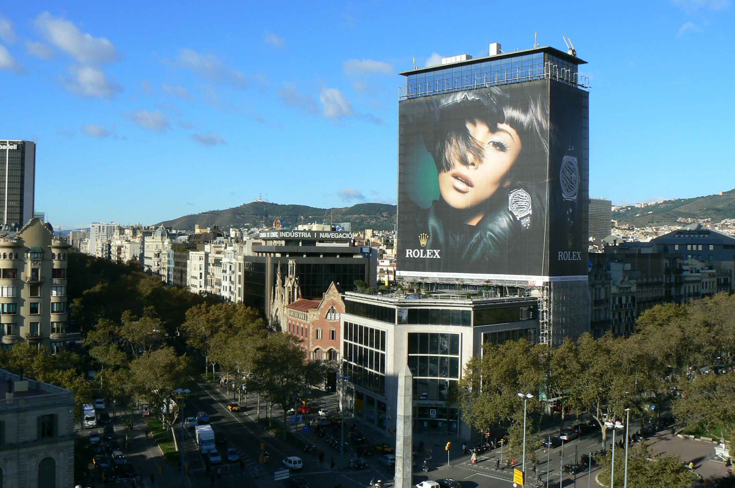 Espectacular lona publicitaria de VSA COMUNICACIÓN y ROLEX en el singular edifico Deutsche Bank ubicado en el chaflán de Paseo de Gracia con la Avenida Diagonal, zona altamente comercial y de gran prestigio publicitario.