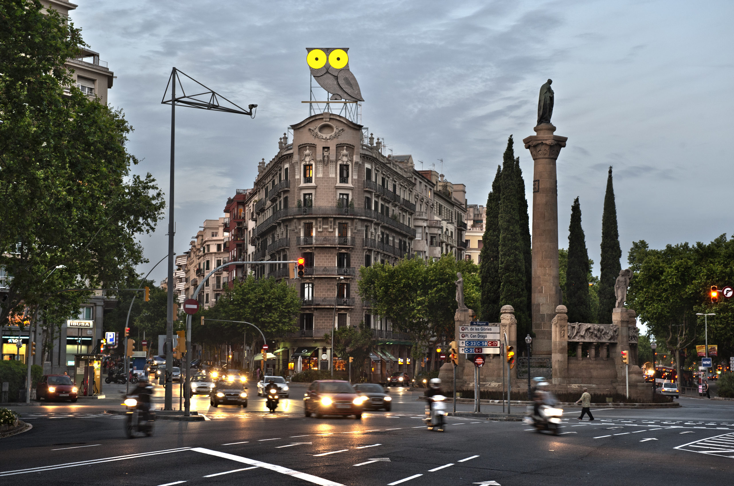 El emblemático BUHO de la Avenida Diagonal con Paseo San Juan de Barcelona es un referente histórico de los rótulos luminosos de los 70.