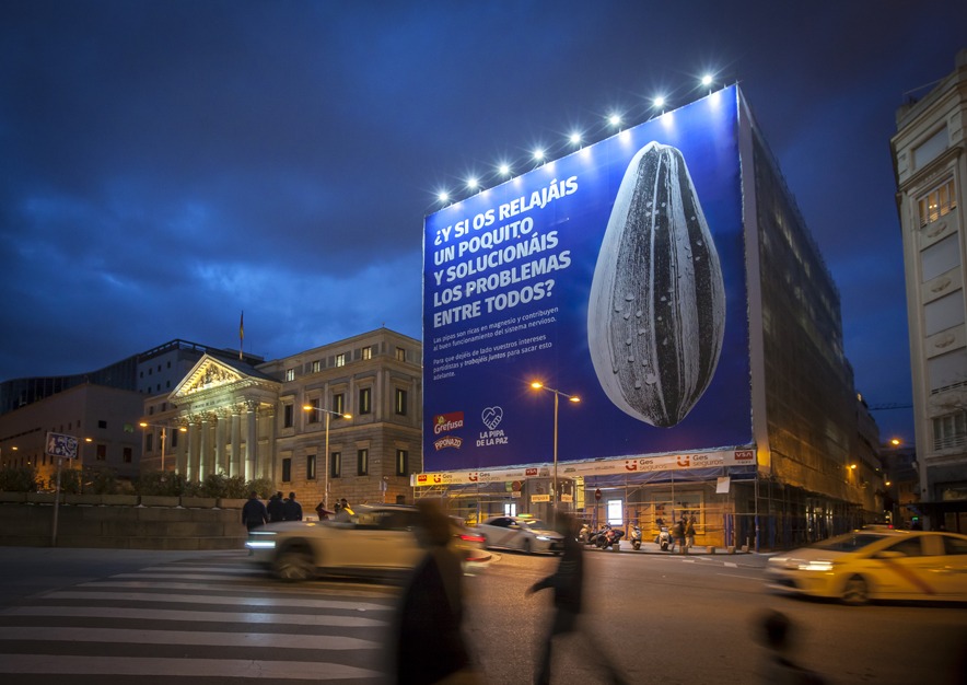 La marca de snacks, patatas fritas y frutos secos Grefusa ha sorprendido Madrid con una lona espectacular instalada por VSA COMUNICACIÓN frente al Congreso de los Diputados. Se trata de una campaña atrevida y con gran sentido del humor que