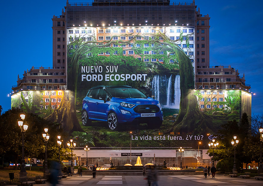 Impresionante y fabulosa campaña de publicidad exterior del nuevo SUV FORD ECOSPORT en el emplazamiento Premium de VSA COMUNICACION en la Plaza España de Madrid. Un claro ejemplo de la magia y elegancia de las lonas publicitarias y el medio exterior. El